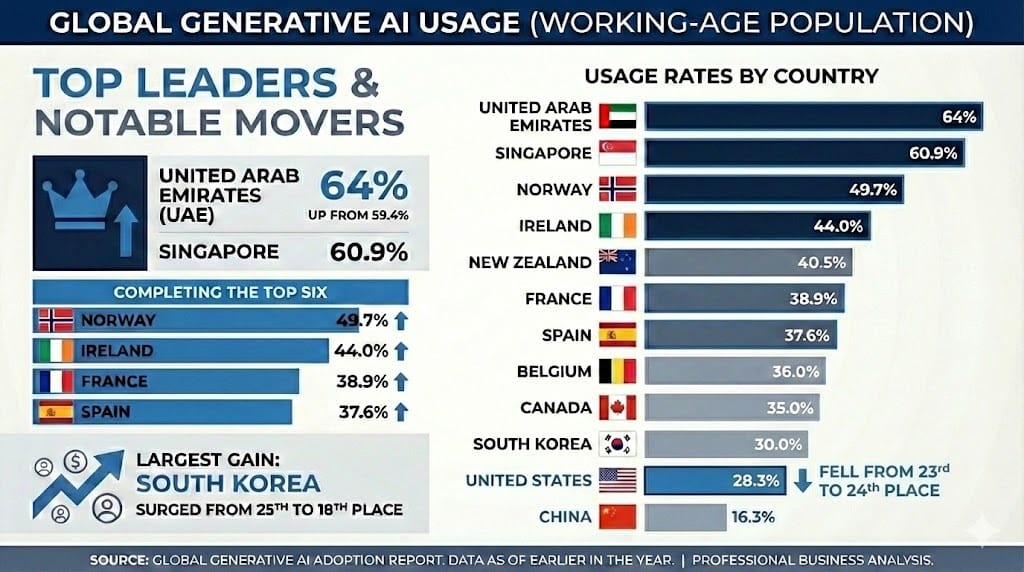 The United Arab Emirates leads the world with 64% of its working-age population using generative AI, up from 59.4% earlier in the year. Singapore follows at 60.9%, Norway, Ireland, France, and Spain completing the top six. South Korea surged from 25th to 18th place, posting the largest single-country gain.