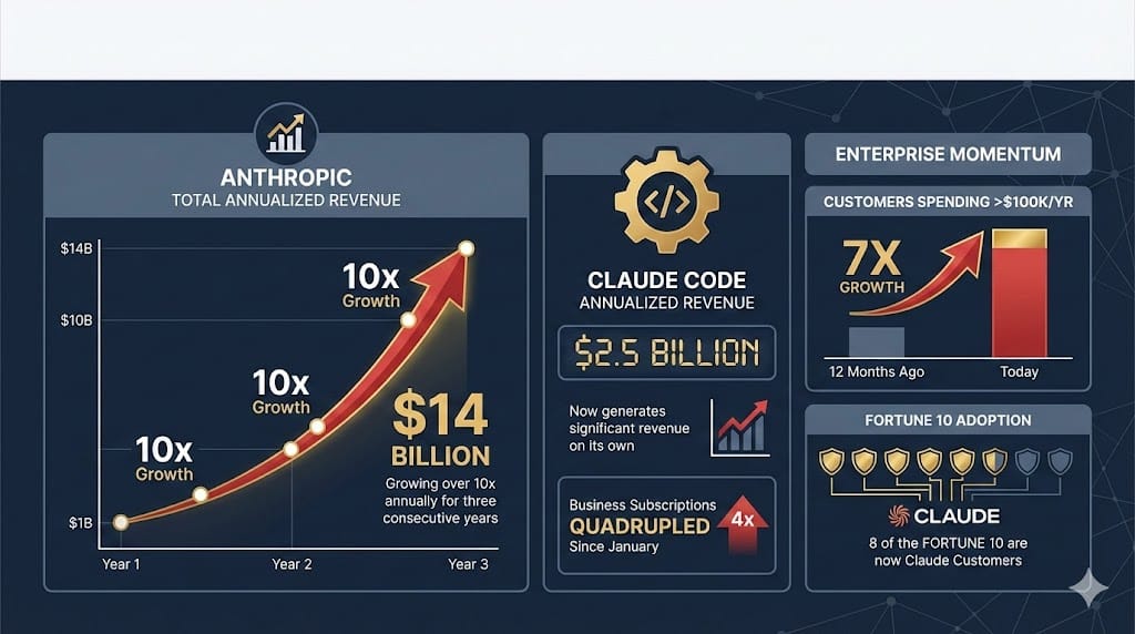 Anthropic’s annualized revenue has reached $14 billion, growing more than 10x annually for three consecutive years. Its AI coding tool Claude Code now generates $2.5 billion in annualized revenue on its own, with business subscriptions quadrupling since January. The number of enterprise customers spending over $100,000 a year grew 7x in the past 12 months. Eight of the Fortune 10 are now Claude customers. A recent analysis estimated that 4% of all public GitHub commits worldwide are now authored by Claude Code, double the share from a month earlier.
