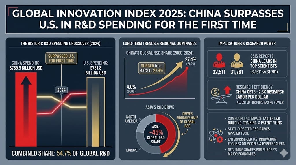 THE BRIEFING: According to the World Intellectual Property Organization’s Global Innovation Index 2025, China surpassed the U.S. in R&D spending for the first time in 2024. Together the two countries account for 54.7% of all global R&D. However, China’s share has surged from 4% in 2000 to 27.4% today. It now fields more top scientists than the U.S. and, thanks largely to Chinese investments, Asia now drives roughly 45% of global R&D. CSIS reports China has also surpassed the U.S. in number of top scientists for the first time (32,511 vs 31,781). Europe’s major economies saw declining global shares across these metrics.