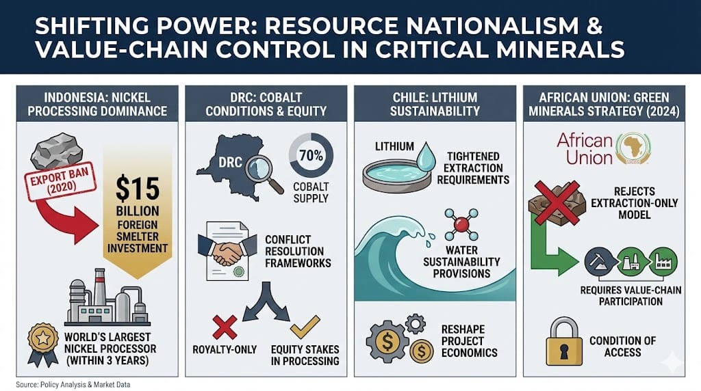 The FORGE and Project Vault programs move U.S. mineral policy from deals to blocs, using price floors and stockpiles to secure aligned supply. However, producer countries are exercising new leverage. Indonesia forced downstream nickel investment. The DRC is demanding equity, not just royalties. Chile is rewriting lithium terms. The African Union has formalized value-chain participation as policy. Many will join Western frameworks and hedge with Beijing simultaneously. Exclusivity offers security for buyers. Stability requires flexibility for sellers.